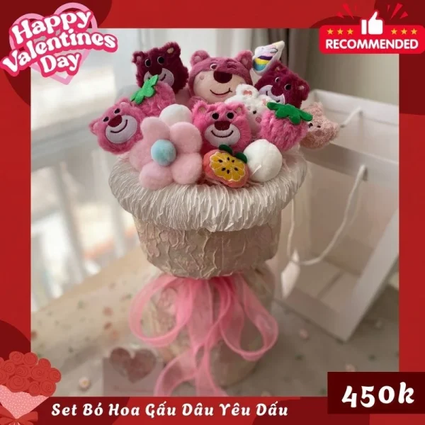 Set Quà Valentine Bó Hoa Gấu Dâu Yêu Tình Đầu